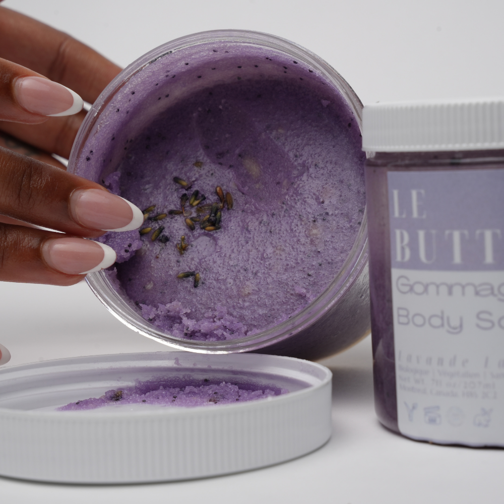 Notre gommage corporel au beurre de karité et à la lavande est suffisamment doux pour tous les types de peau, y compris les peaux sensibles.